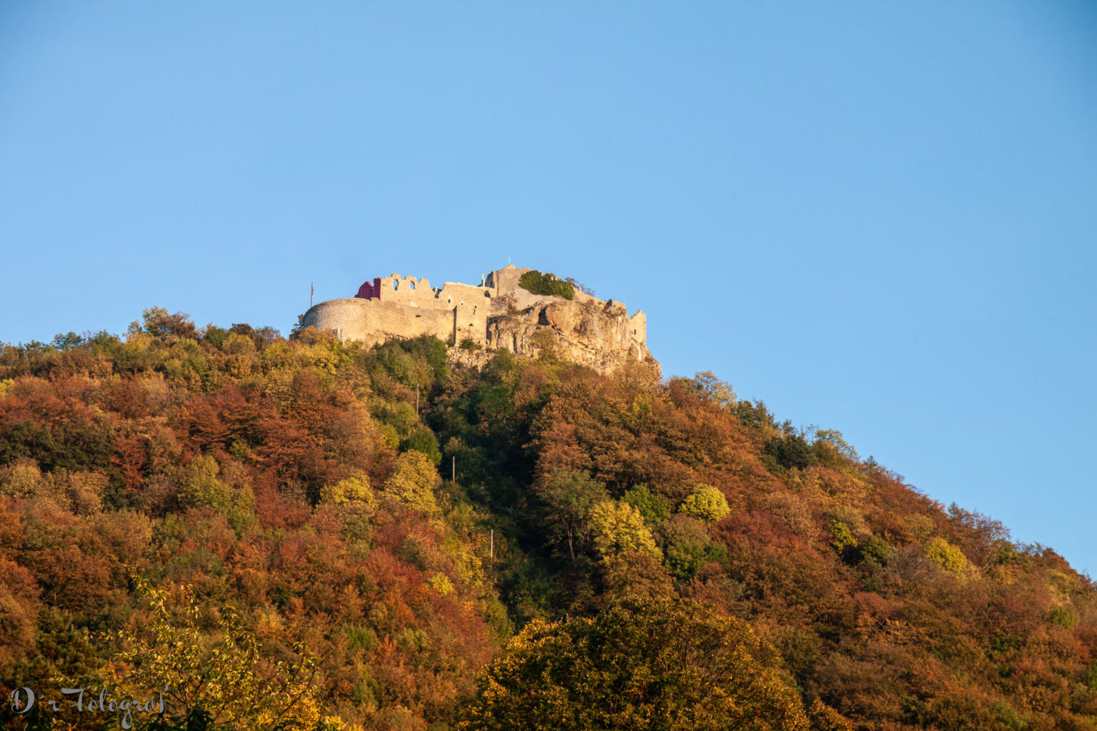 Der »Hohenneuffen« auf der Schwäbischen Alb, auf dem Gipfel eines bewaldeten Berges in den schönsten Herbstfarben