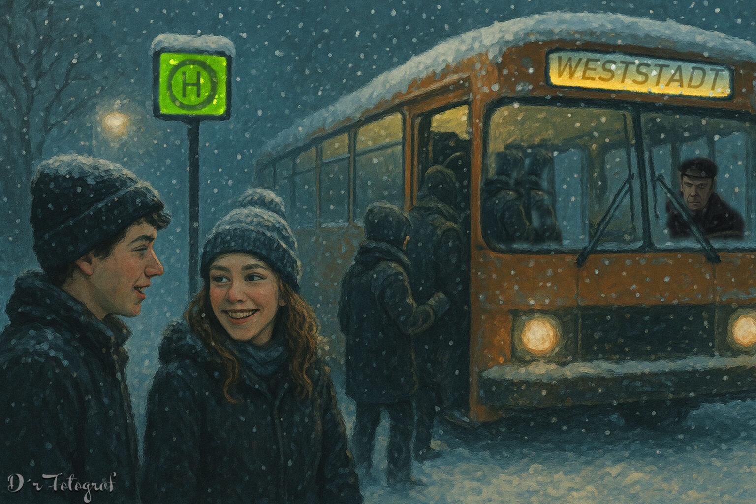 Er hatte sie zum Bus begleitet. Die Stadt war nicht groß, aber irgendwie weitläufig und er wohnte im Norden und sie im Westen. Und in der Stadtmitte fuhr der Bus. Busse des Verkehrsunternehmens dort waren berühmt-berüchtigt. Innen drin kalt, nass und nicht selten sah man auch, wenn man sich ein wenig anstrengte, durch kleine Rostlöcher auf die Straße.
