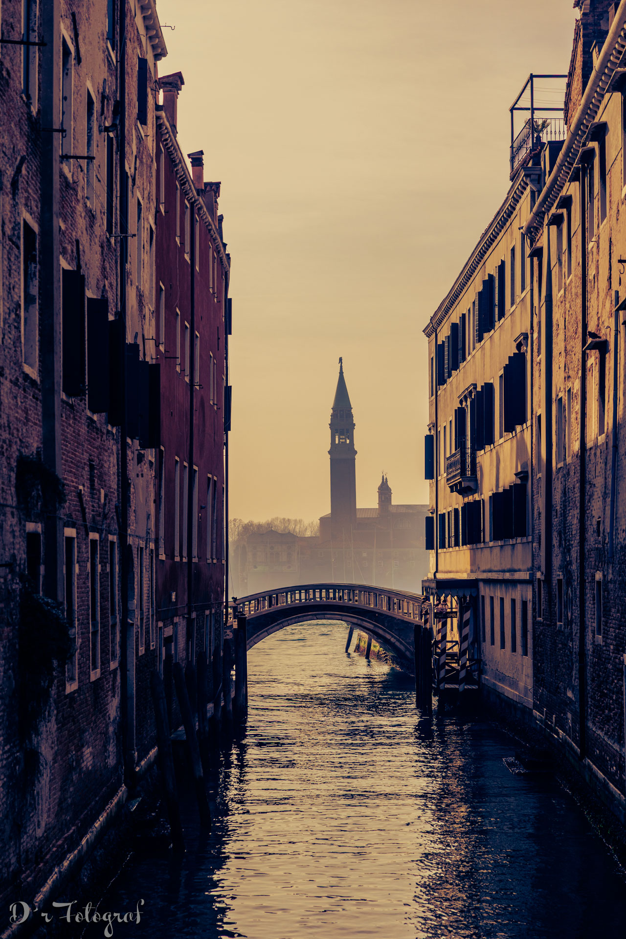 Das Bild zeigt den Blick von einer Brücke des Rio de la Pleta auf den Campanile di San Giorgio Maggiore.