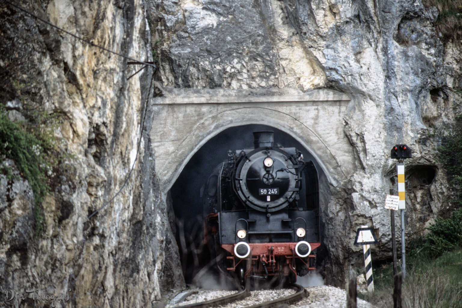 In 1993, steam locomotives were no more in regular service for more than 20 years. Some years after 1970, they are even not allowed to pass the official federal railroad routes. Nevertheless, some people came together and founded cooperatives to save the old ladies from getting scrapped. One of these clubs was (and is still) the “Eisenbahnfreunde Zollernbahn” (Zollernbahn Railway Enthusiasts). In 1993, they celebrated their 20th anniversary, and I was happy to catch this steam engine when it is coming out of a tunnel.