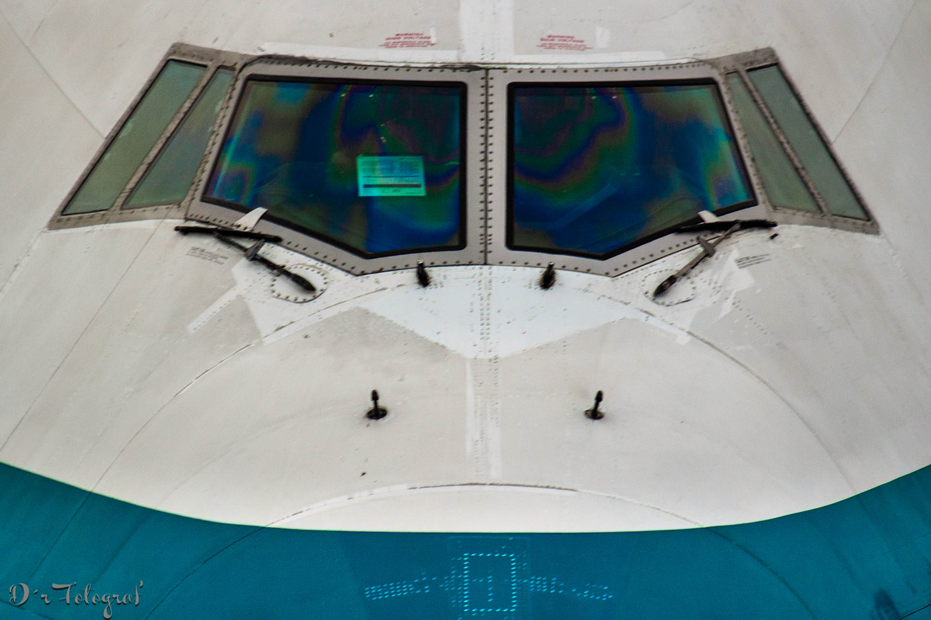 Es zeigt die Cockpitfenster der Boeing 747-412, Kennung B-HKE der Cathay Pacific.
